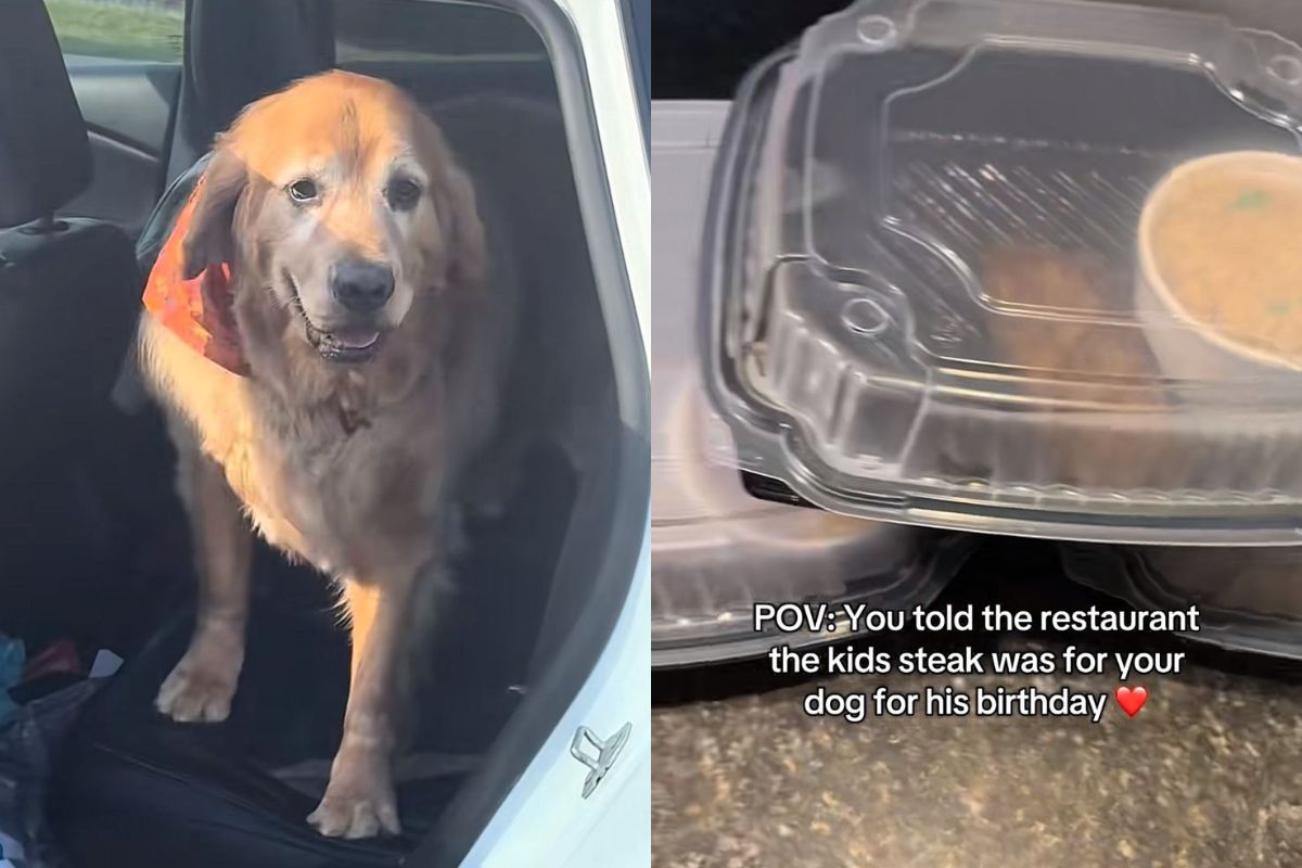 Para comemorar o aniversário do cachorro, a tutora pediu um bife em um restaurante. Ao abrir a embalagem, teve uma surpresa especial